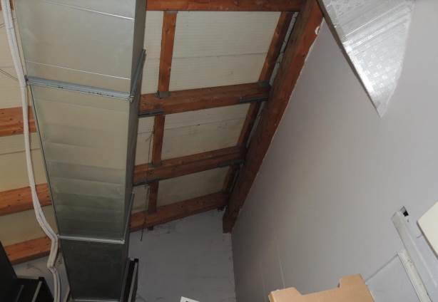 finestrature su tutto il perimetro, copertura a falde a vista con orditura in legno,