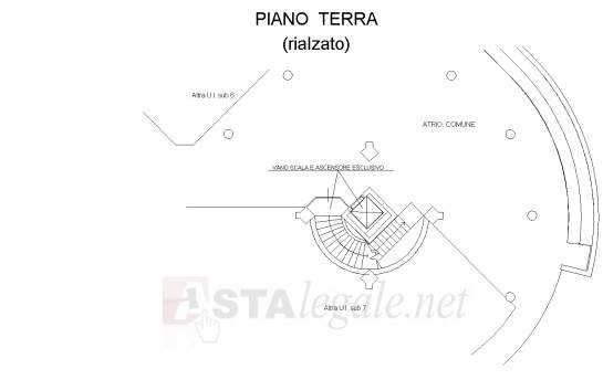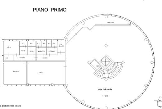 ascensore esclusivi. Pianta circolare della sala, corpo cucina e servizi, il tutto con
